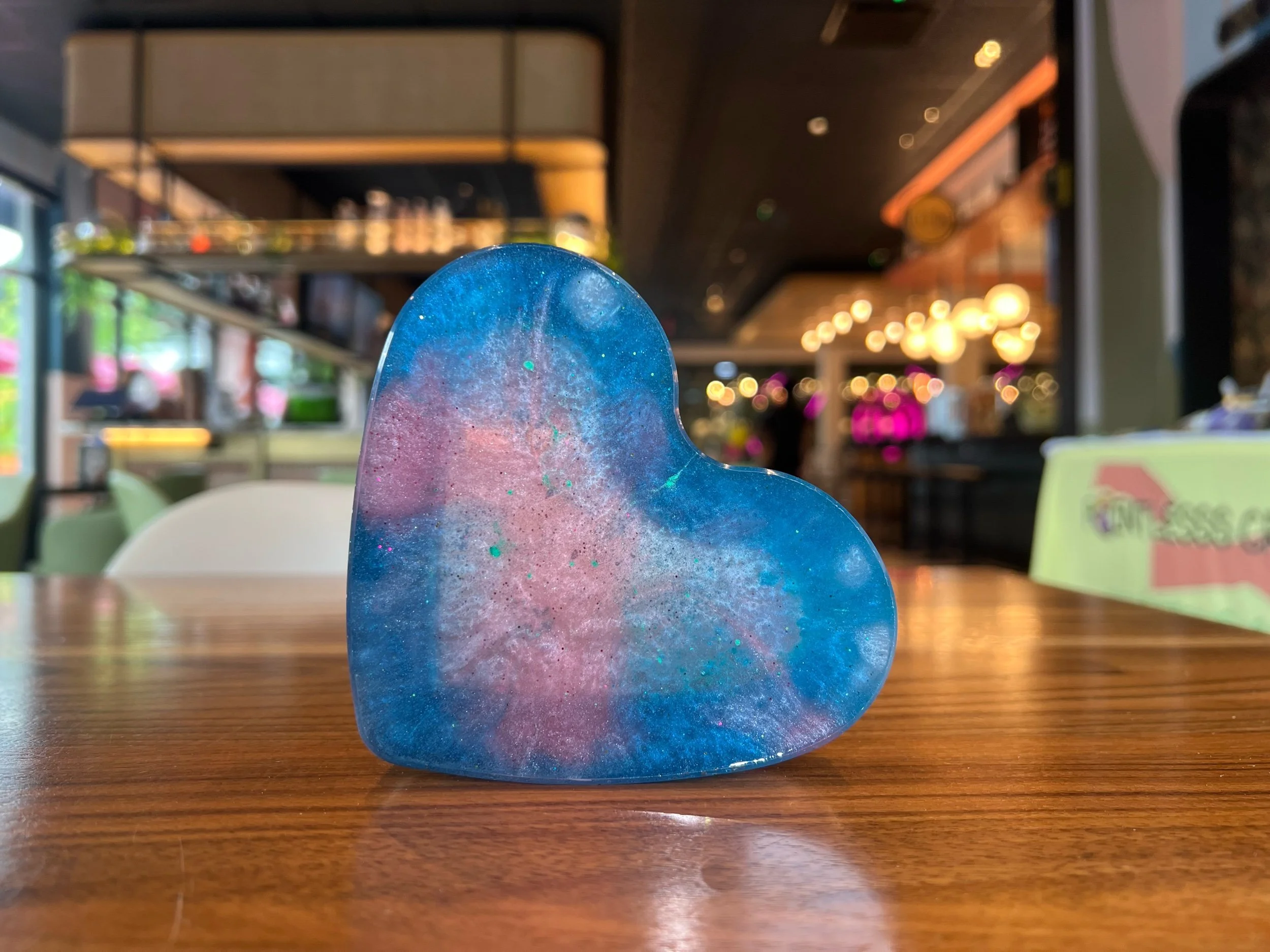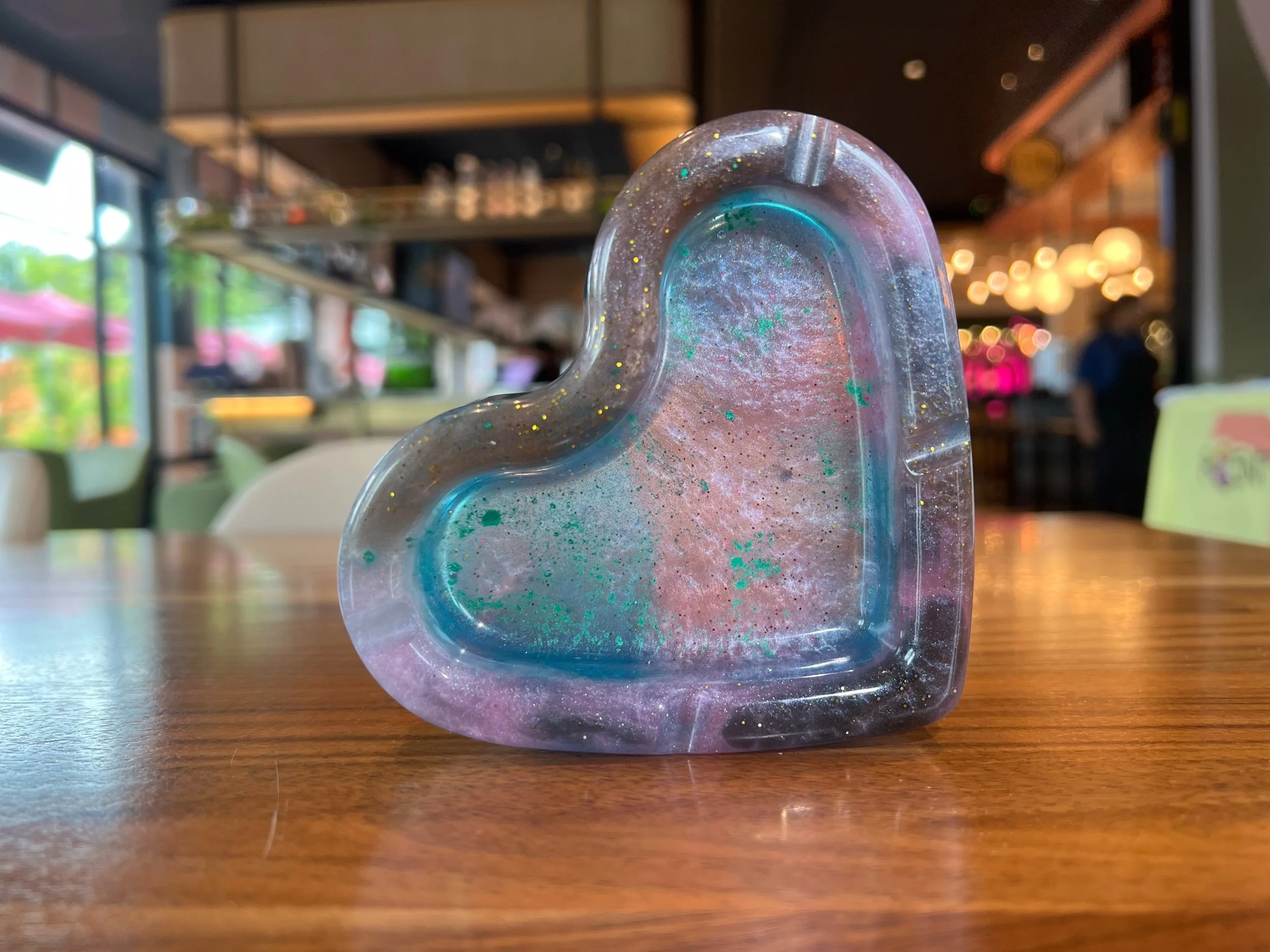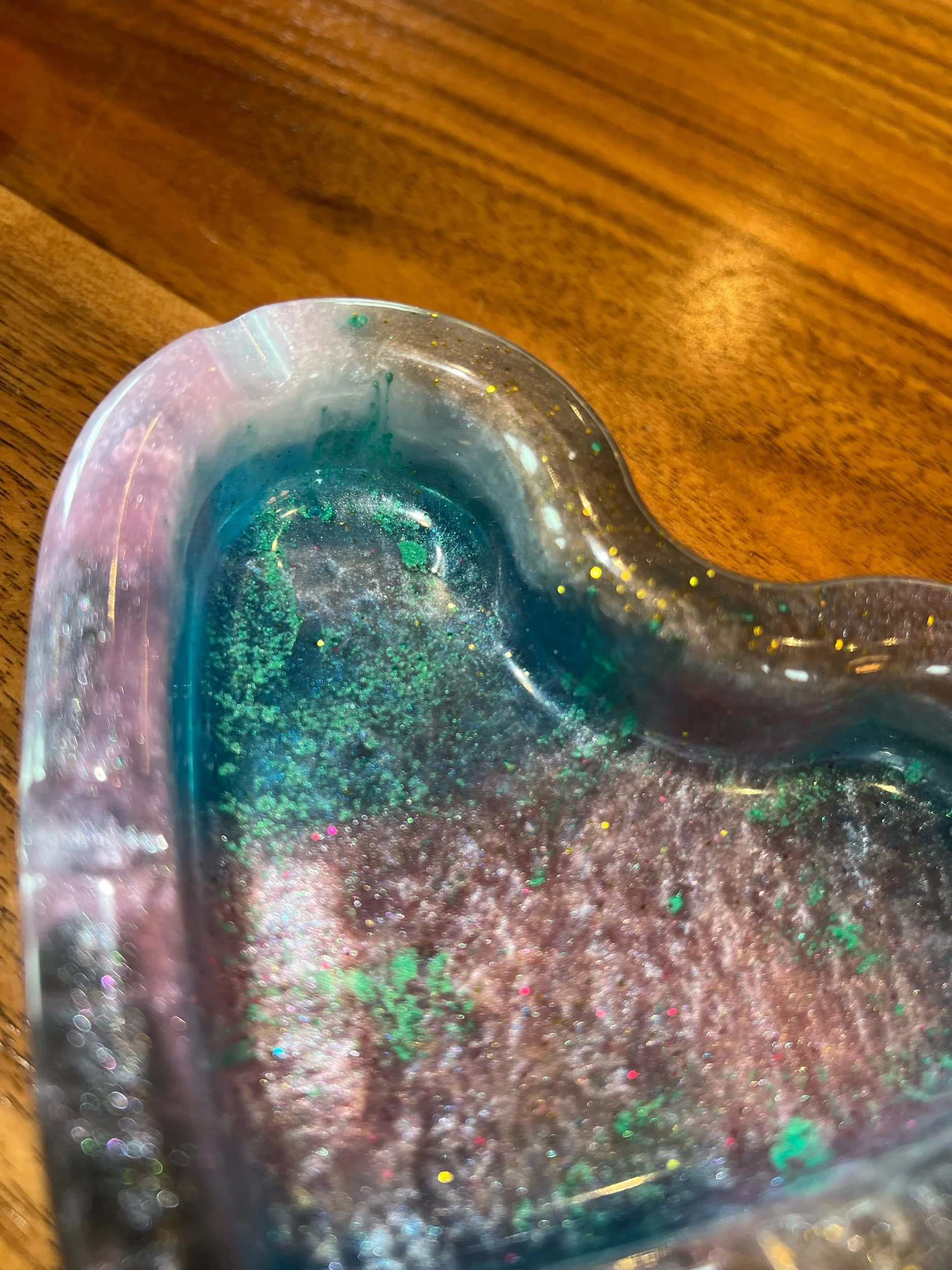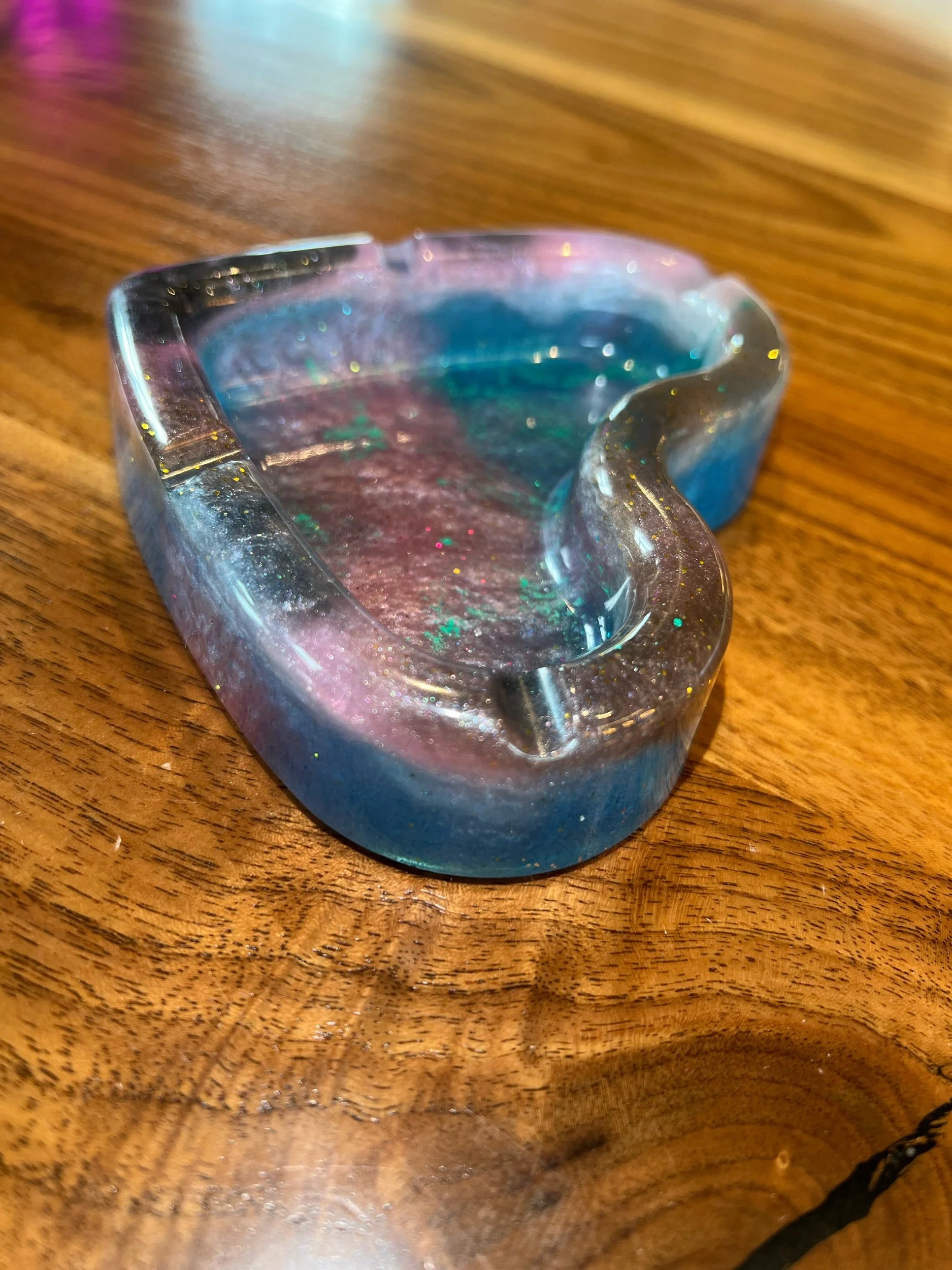 Blue with pink and glitter, heart shaped tray with 4 holders.