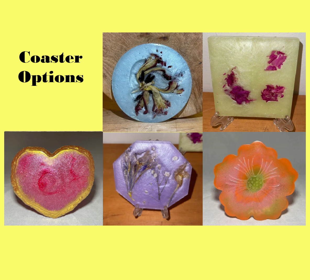 Resin requires curing time. Finished coasters will be ready for pickup within 1–2 days.